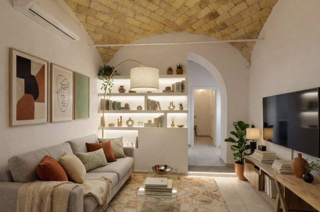 La zona giorno si apre su un living con predisposizione per angolo cottura, ben organizzato e valorizzato da illuminazione integrata e soluzioni su misura. Un elegante passaggio a semi-arco accompagna alla zona notte, composta da una camera da letto intima e accogliente, separata ma in continuità stilistica con il resto dell'abitazione.